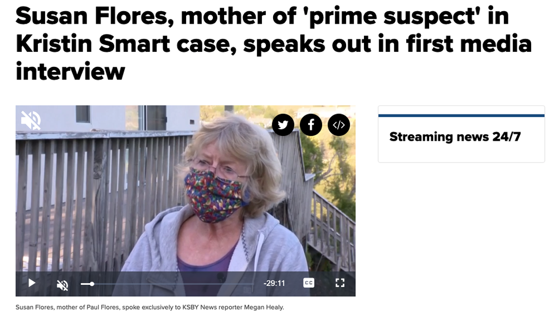 In her first interview since Cal Poly student Kristin Smart went missing nearly 25 years ago, Susan Flores, the mother of the “prime suspect” in the case, told KSBY on Tuesday that her son is innocent, nobody in her family bears any responsibility for Smart’s disappearance, and she feels her family has been harassed by the public, media and law enforcement for years.