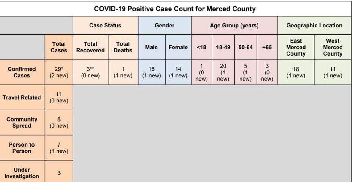 The Merced County Department of Public Health reported Sunday there were 29 confirmed coronavirus infections in Merced County — up from 27 a day earlier.